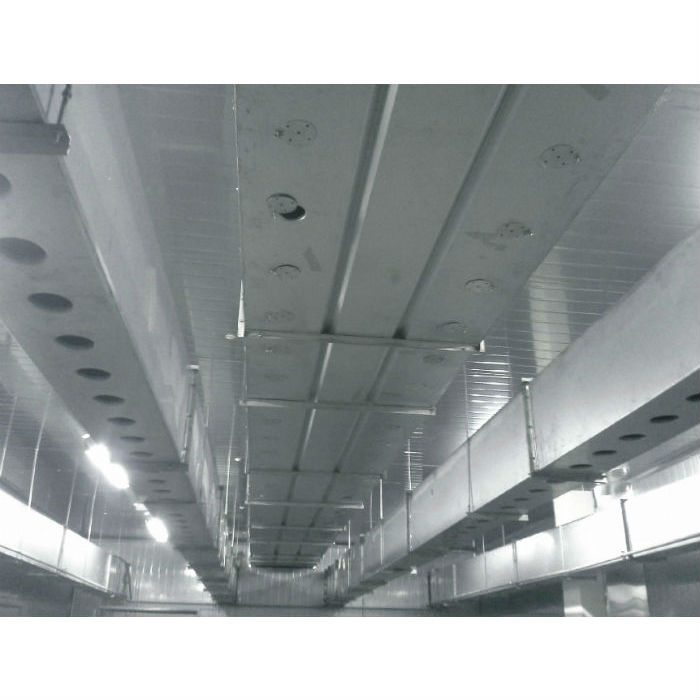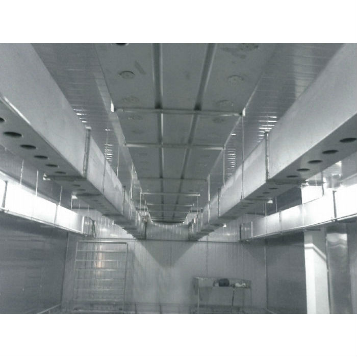 利用低壓蒸汽直接對凍肉進行解凍,蒸汽管道直接進入解凍間,分布在送風(fēng)管道的下方,由蒸汽管上的小孔噴出。解凍過程,由冷風(fēng)機的送風(fēng)、吸風(fēng),保證解凍間的高濕空氣循環(huán)流動。