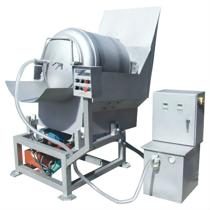 1. 采用轉(zhuǎn)動支架,臥式傾斜滾揉,具有更大的裝載能力和更方便地卸料性能。適用于西式香腸、火腿、培根、烤肉以及傳統(tǒng)中式禽類、醬鹵類、休閑類肉食品的腌制加工。