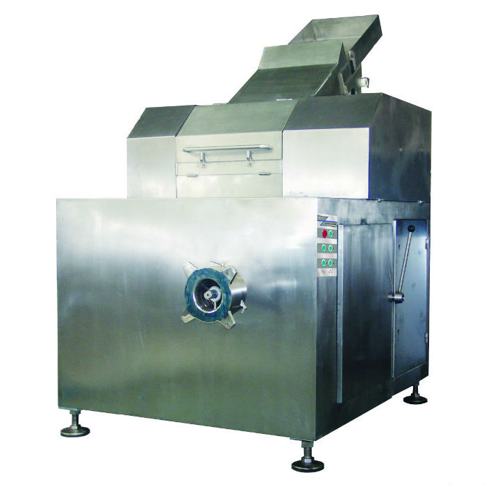 結(jié)構(gòu):進(jìn)料系統(tǒng)、切塊系統(tǒng)、送料系統(tǒng)和絞肉系統(tǒng)。在切塊和絞肉系統(tǒng)中間有強(qiáng)磁系統(tǒng)以防有鐵質(zhì)材料進(jìn)入絞肉機(jī)系統(tǒng)。