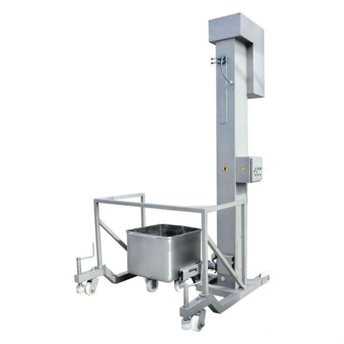 TY200移動提升機是專為200L標準肉車配套的提升設(shè)備,底盤配有萬向輪,可在車間內(nèi)移動。用于肉制品加工生產(chǎn)線提升肉料,取代了人工加料的繁瑣操作,其功能是將肉料提升到一定高度后,傾倒至設(shè)備的料斗中,以完成加料工作,半自動化控制大大降低了人工勞動強度。