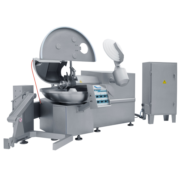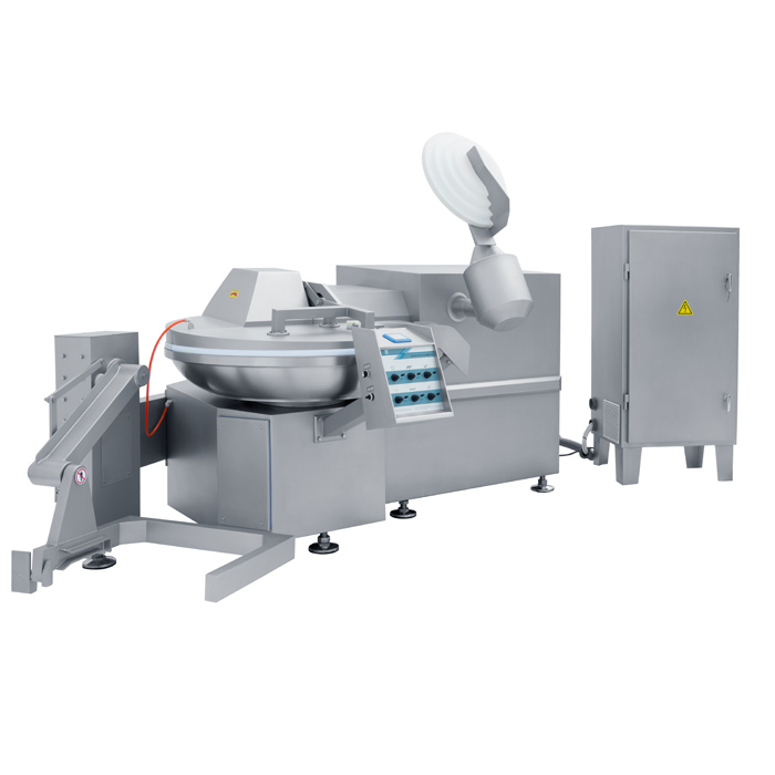 斬鍋由電機(jī)通過(guò)減速機(jī)低速旋轉(zhuǎn),不斷向刀組送料。刀軸由雙速電機(jī)(或變頻電機(jī))經(jīng)皮帶帶動(dòng)高速旋轉(zhuǎn)。原料在斬鍋中作螺旋式運(yùn)動(dòng)的同時(shí),被刀組攪拌和切碎并排除肉糜中的空氣,由于切刀的高速斬切,減少了產(chǎn)品的液汁分離率,保證了乳化效果,增強(qiáng)了產(chǎn)品的彈性和細(xì)膩度。