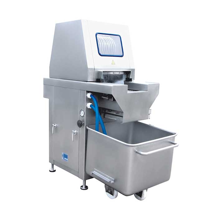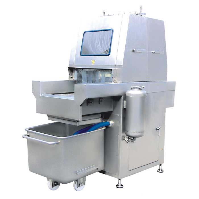 ◇ 可帶骨注射(設(shè)有自動(dòng)保護(hù)裝置,當(dāng)注射針碰到硬物時(shí),注射針隨之抬起,不受損壞;注射針可方便調(diào)節(jié)安裝)。注射針設(shè)計(jì)獨(dú)特、排列合理,料水可均勻分布在肉塊中,注射率可調(diào)。